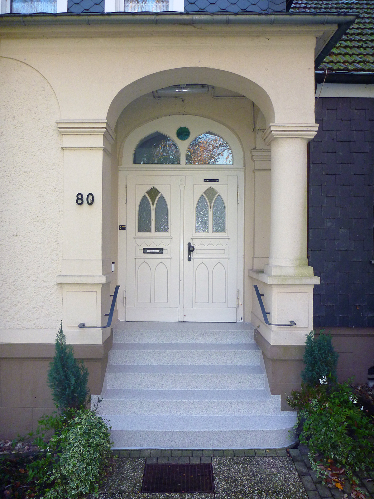 Mit neuem Fensterfeld, Markise und moderner Tür, angeglichener Zuwegung und Fußboden-Ausgleich fungiert dieser Eingang seither als sehr ansehnlicher Haupteingang.