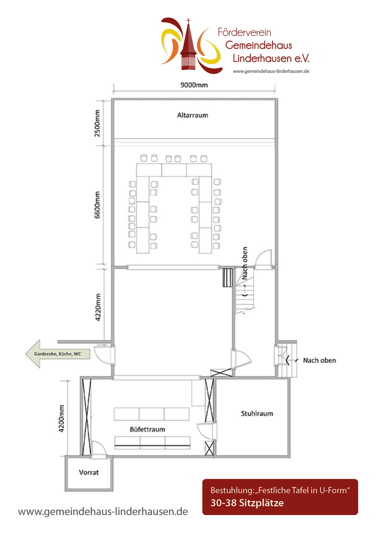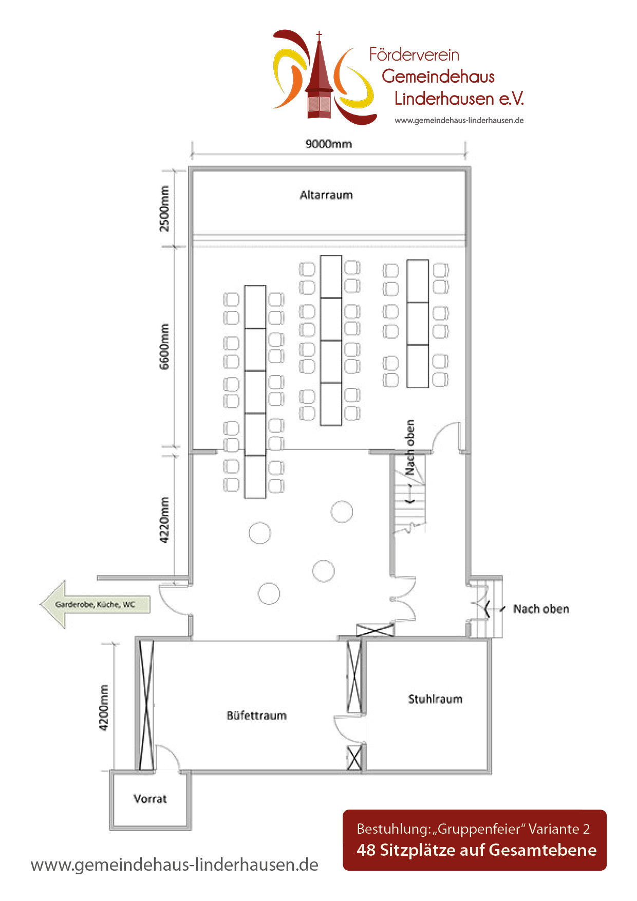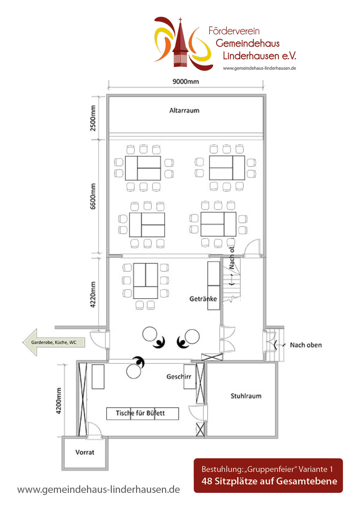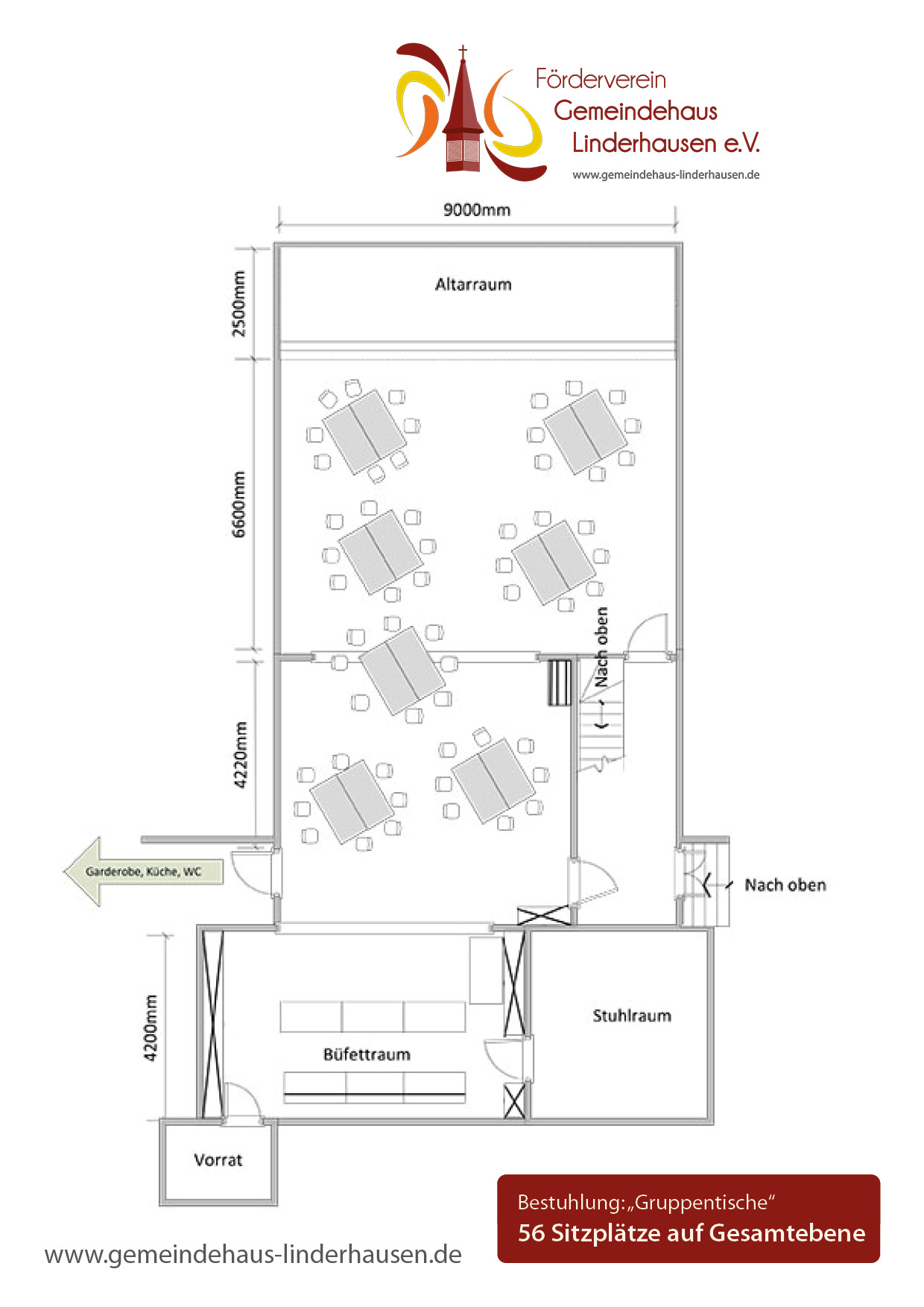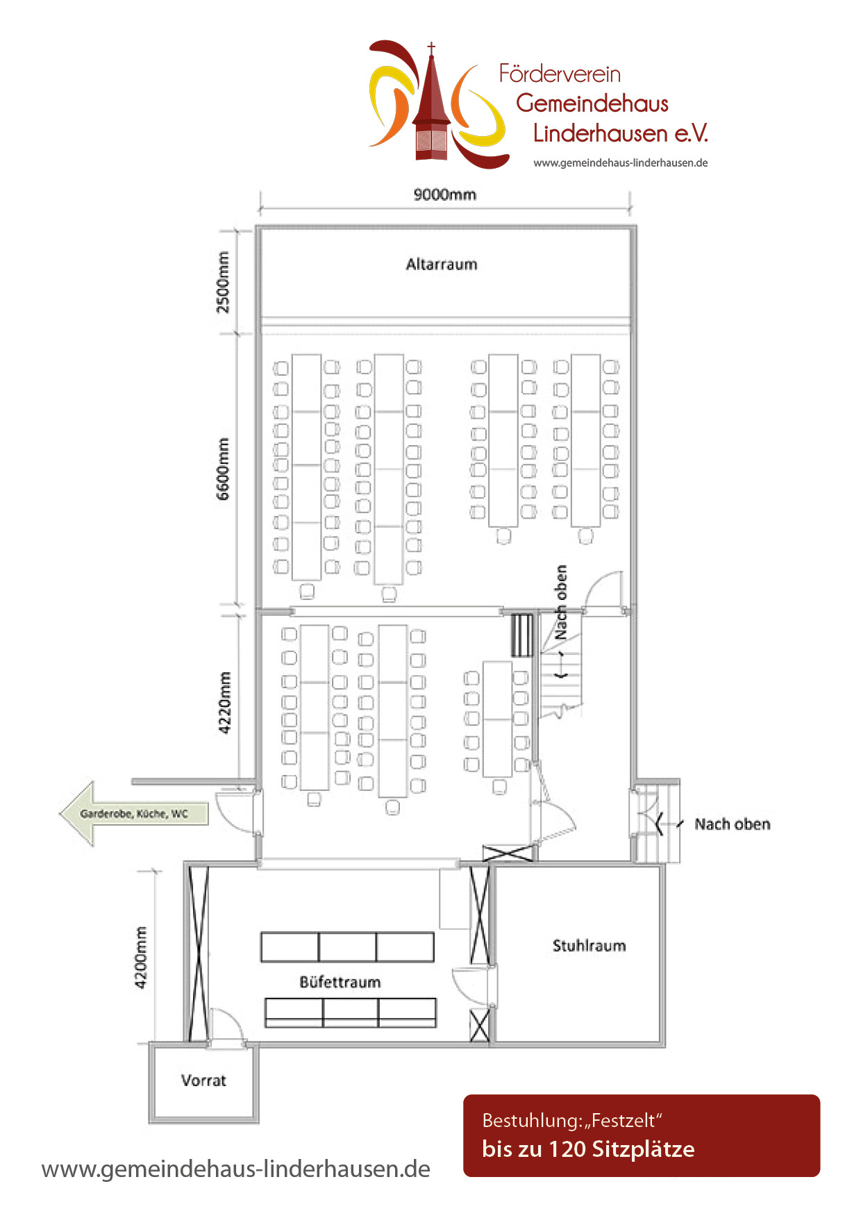 Um Ihnen die zahlreichen Möglichkeiten für die Bestuhlung und Nutzungsvarianten zu erläutern, haben wir unten ein paar Bestuhlungspläne als Ansicht zur Verfügung gestellt. Mit einem Klick auf die Bilder, erhalten Sie eine größere Ansicht der Bestuhlungspläne. Sofern gewünscht, können Sie die Darstellungen auch herunterladen.