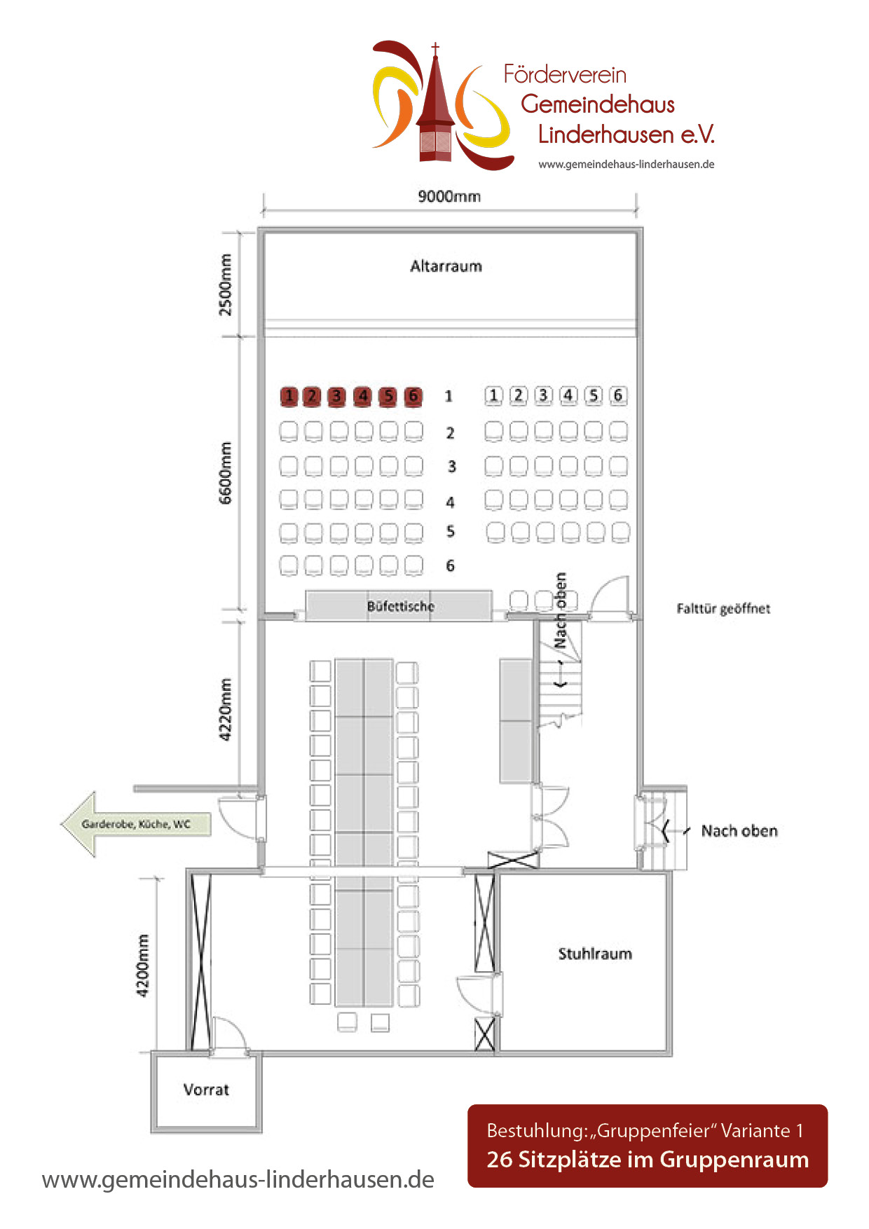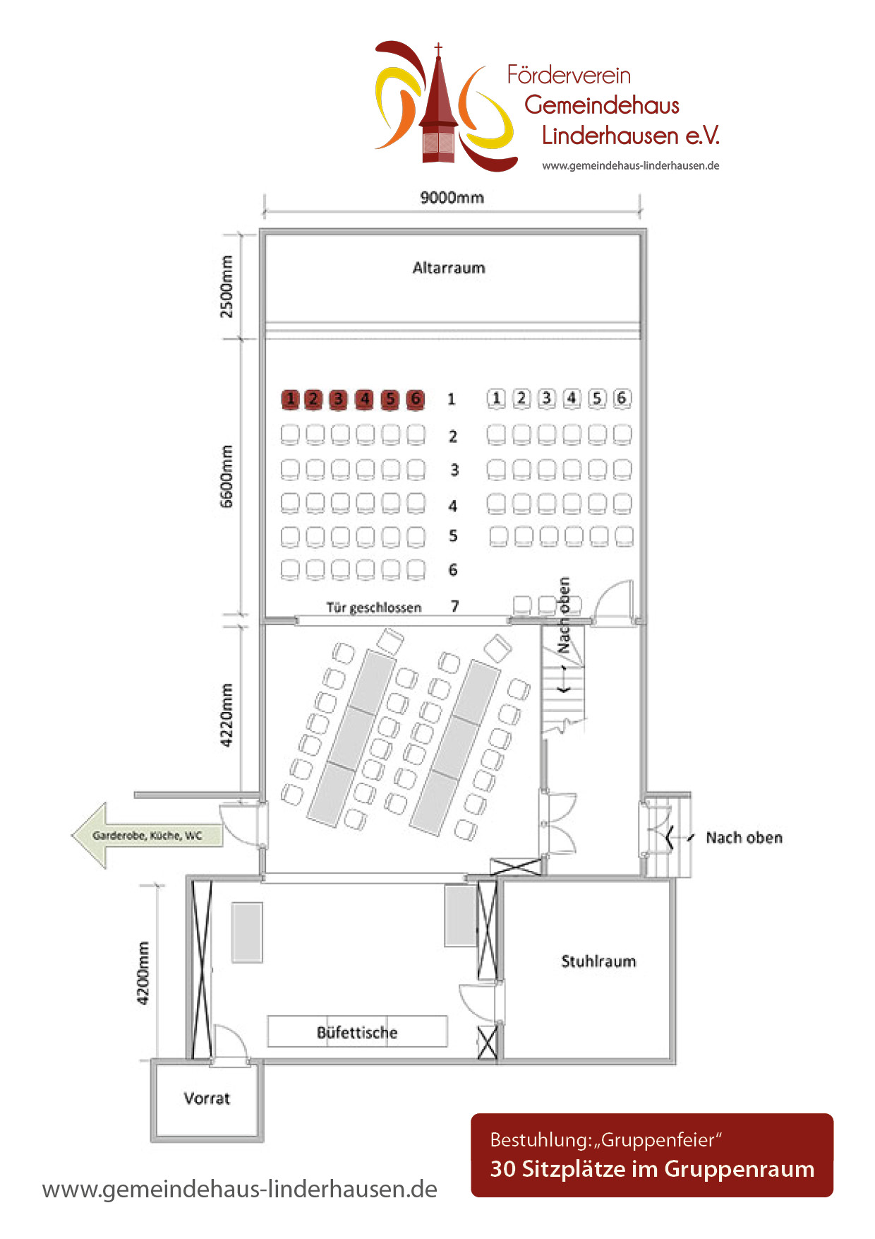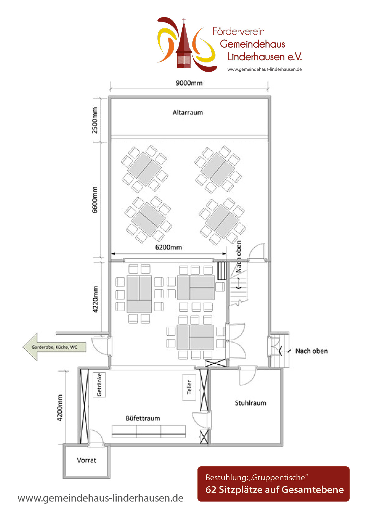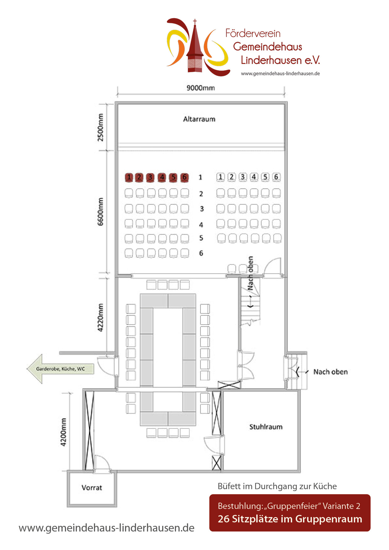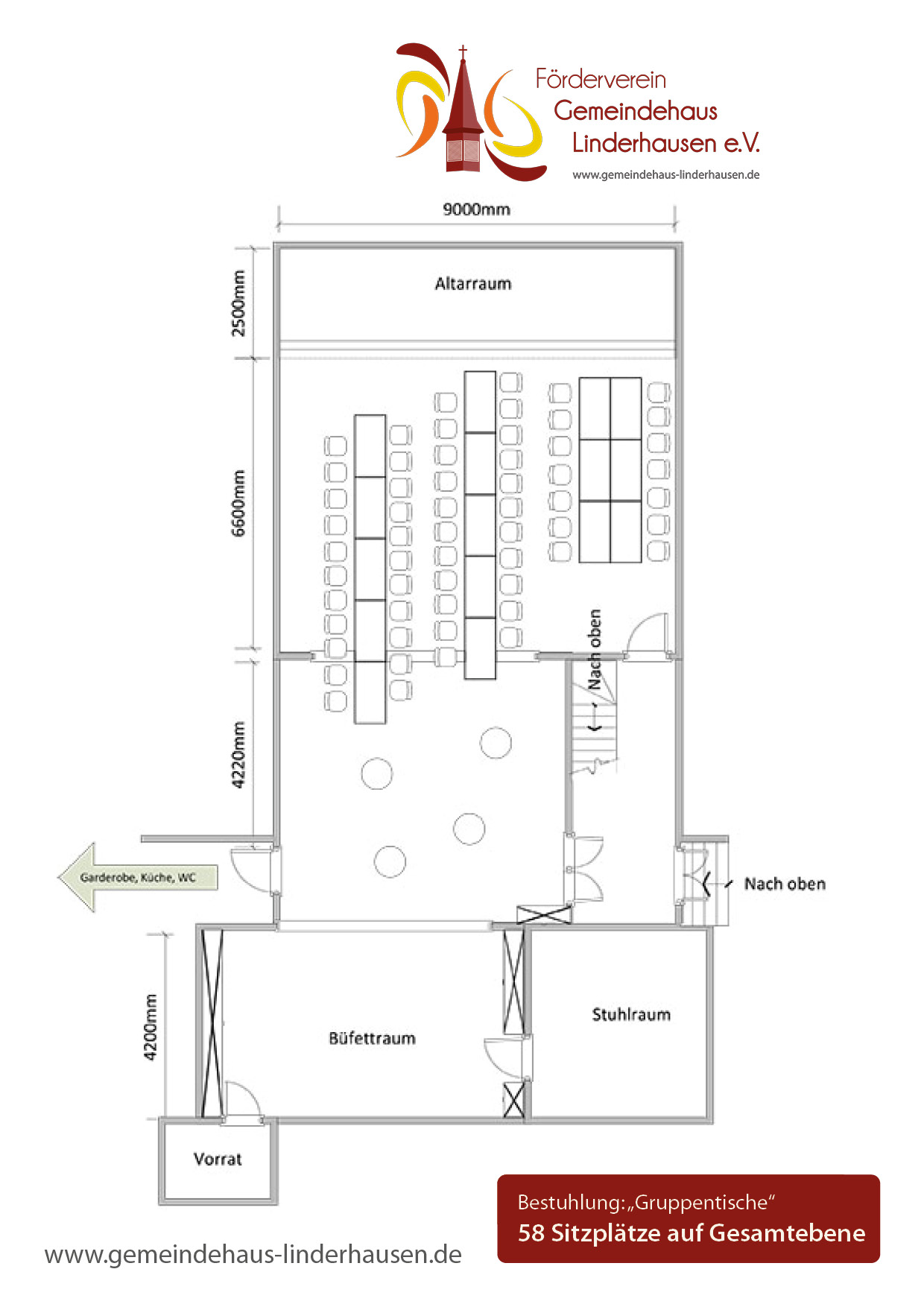 Um Ihnen die zahlreichen Möglichkeiten für die Bestuhlung und Nutzungsvarianten zu erläutern, haben wir unten ein paar Bestuhlungspläne als Ansicht zur Verfügung gestellt. Mit einem Klick auf die Bilder, erhalten Sie eine größere Ansicht der Bestuhlungspläne. Sofern gewünscht, können Sie die Darstellungen auch herunterladen.